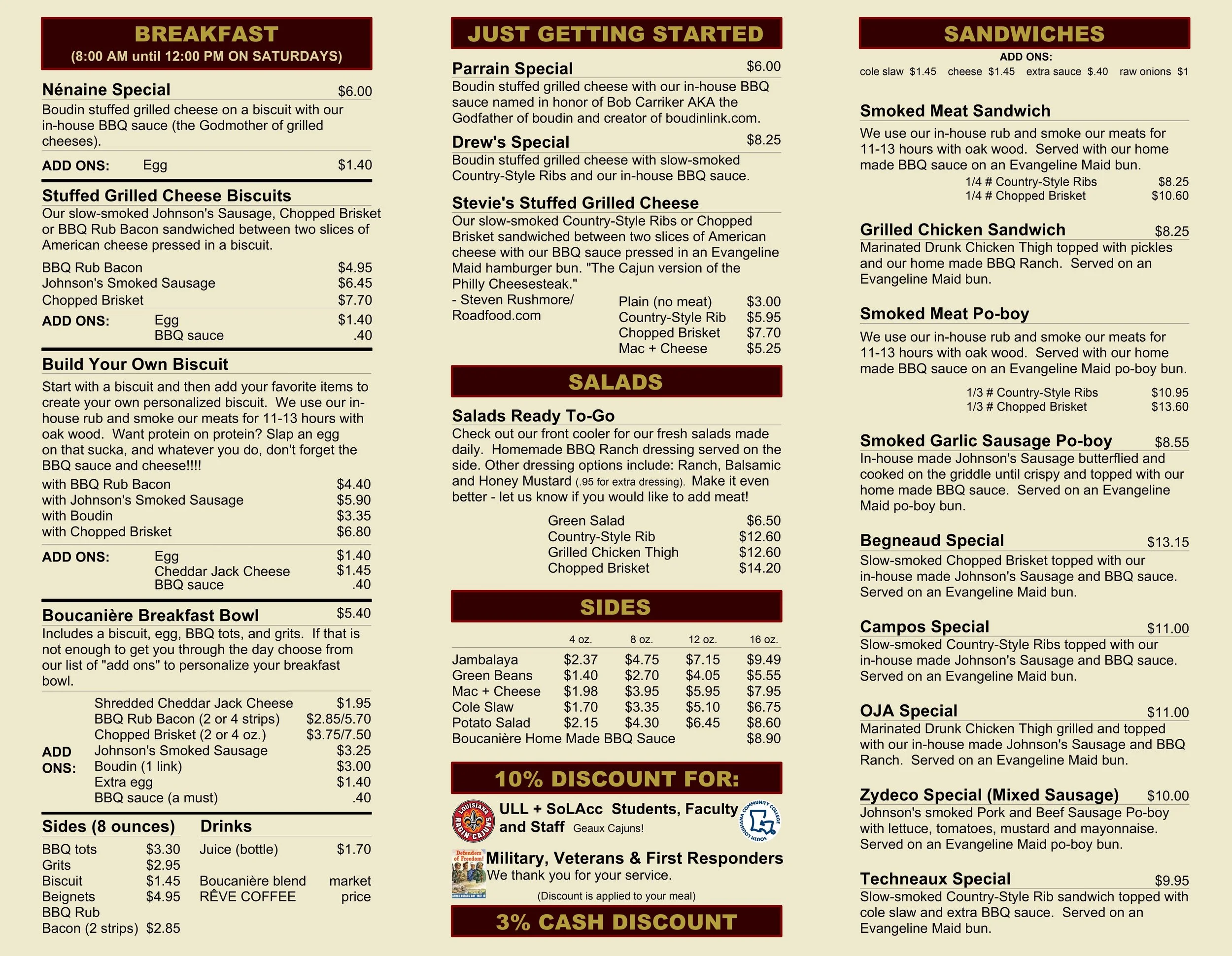 Available Wednesdays - Fridays from 10AM-3PM, Saturdays from 8AM-3PM and Sundays from 10AM-2PM (Note: all prices, items, and hours are subject to change)